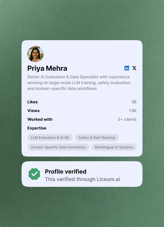 Trust works both ways. To join Liceum.ai, every expert must complete AI-enabled identity verification. This keeps the platform secure and ensures clients trust the person behind the screen