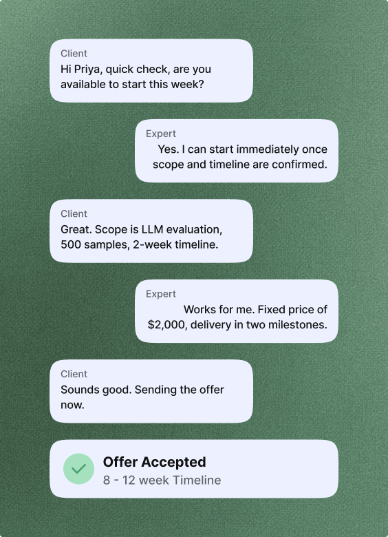 Chat with the team to confirm scope and pricing. Once you accept an offer, work begins immediately